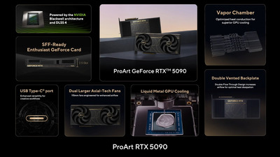 thumbnail image892: Socket774 警備員[Lv.0][新芽] (ワッチョイ 1f2a-Orn6) 2026/01/07(水) 07:25:38.73 ID:3y/VqUey0ASUSはGeForce RTX 5090 ProArtを発表した。これはRTX 5090 Founders Editionと同じダブルフロースルーコンセプトを採用した2.5スロットのパートナーカードである。NVIDIAによれば…