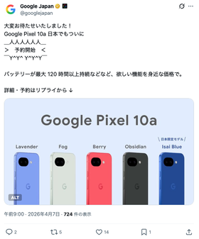 1: それでも動く名無し 2026/04/07(火) 09:06:26.54 ID:+D2zPFwK0大変お待たせいたしました!Google Pixel 10a 日本でもついに_人人人人人人_> 予約開始 < ̄Y^Y^ Y^Y^Y ̄バッテリーが最大 120 時間以上持続などなど、欲しい機能を身近な価格で。詳細・予約はリプライから ↓ pic.twitter.com/NzsLx8e6FD— Goo…